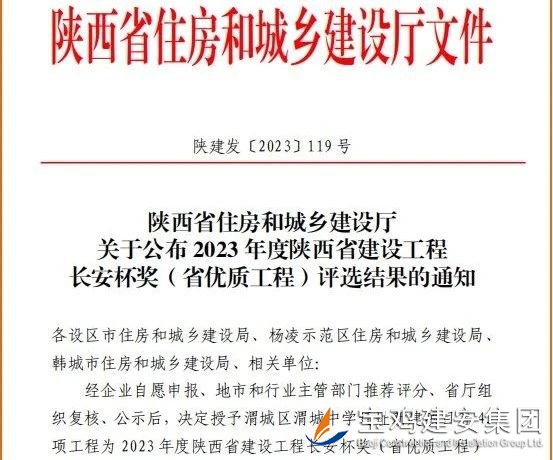 近日,陜西省住房和城鄉(xiāng)建設廳《關于公布2023年度陜西省建設工程長安杯獎(省優(yōu)質工程)評選結果的通知》正式下發(fā),公司承建的中共寶雞市委黨校遷建工程榮登金榜,為集團再添一項陜西省建設工程“長安杯”獎。